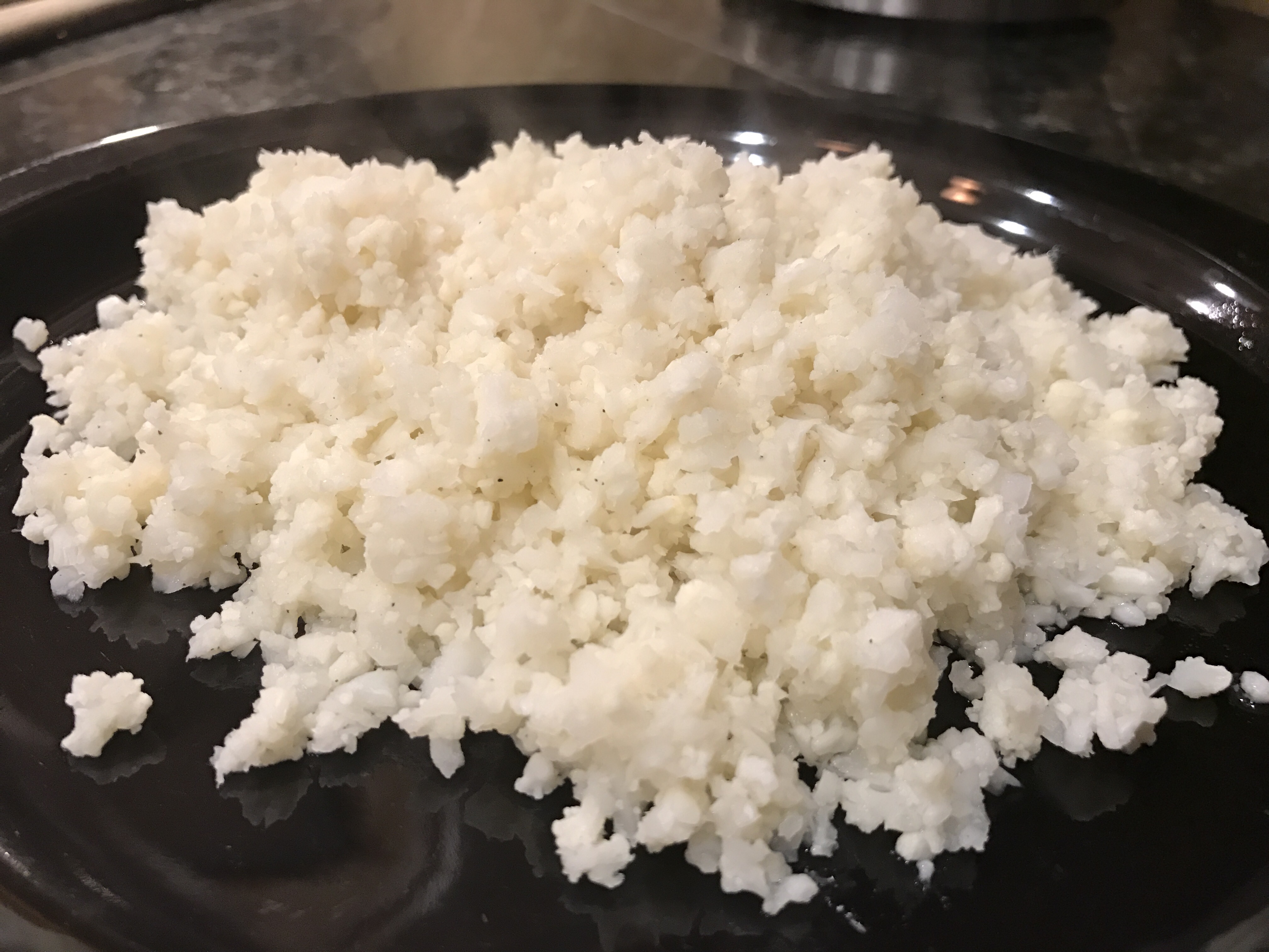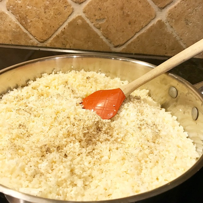 You are looking for a chopped consistency that resemble granules of rice. Once the entire cauliflower is processed, toss it into a pan with about a cup of bone broth (you can use water or any broth of your preference, season with salt and pepper, cover with a lid, and steam on high.