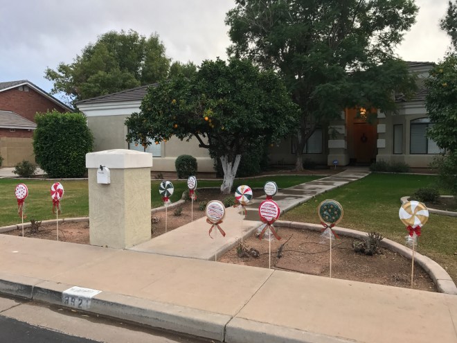 This is our second time around making these DIY Lollipop Christmas Decorations. The first time we made them, they weathered two Arizona winter’s before looking a little rough. They are so easy and inexpensive to make, that I tossed them in the recycle bin, and started fresh this year.