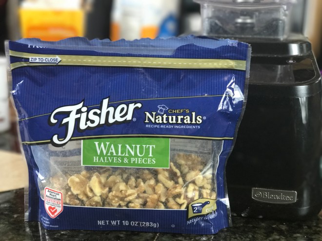 Step 2: Chop the walnuts. I chopped mine using the Blendtec on the lowest setting. Once chopped, I added them to the dough and continued mixing.