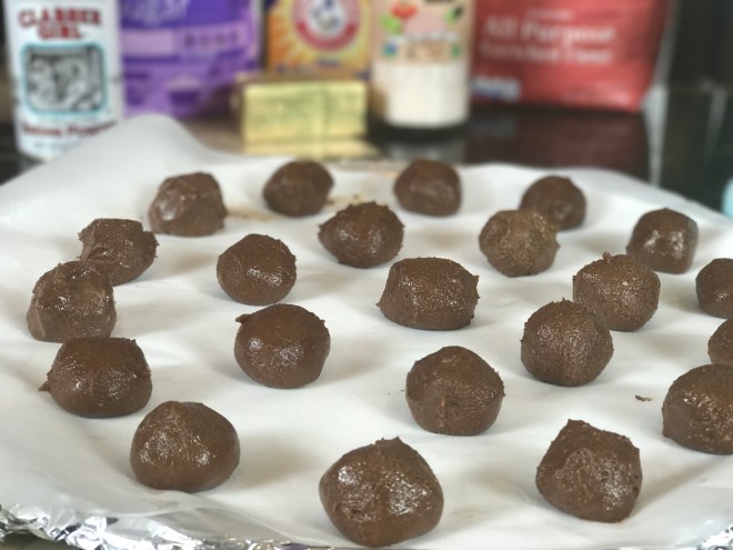 Step 4: Butter hands, and roll the dough into 1 inch balls. Place on a cookie sheet, lined with parchment paper.