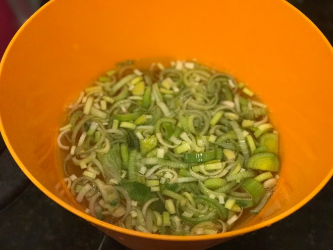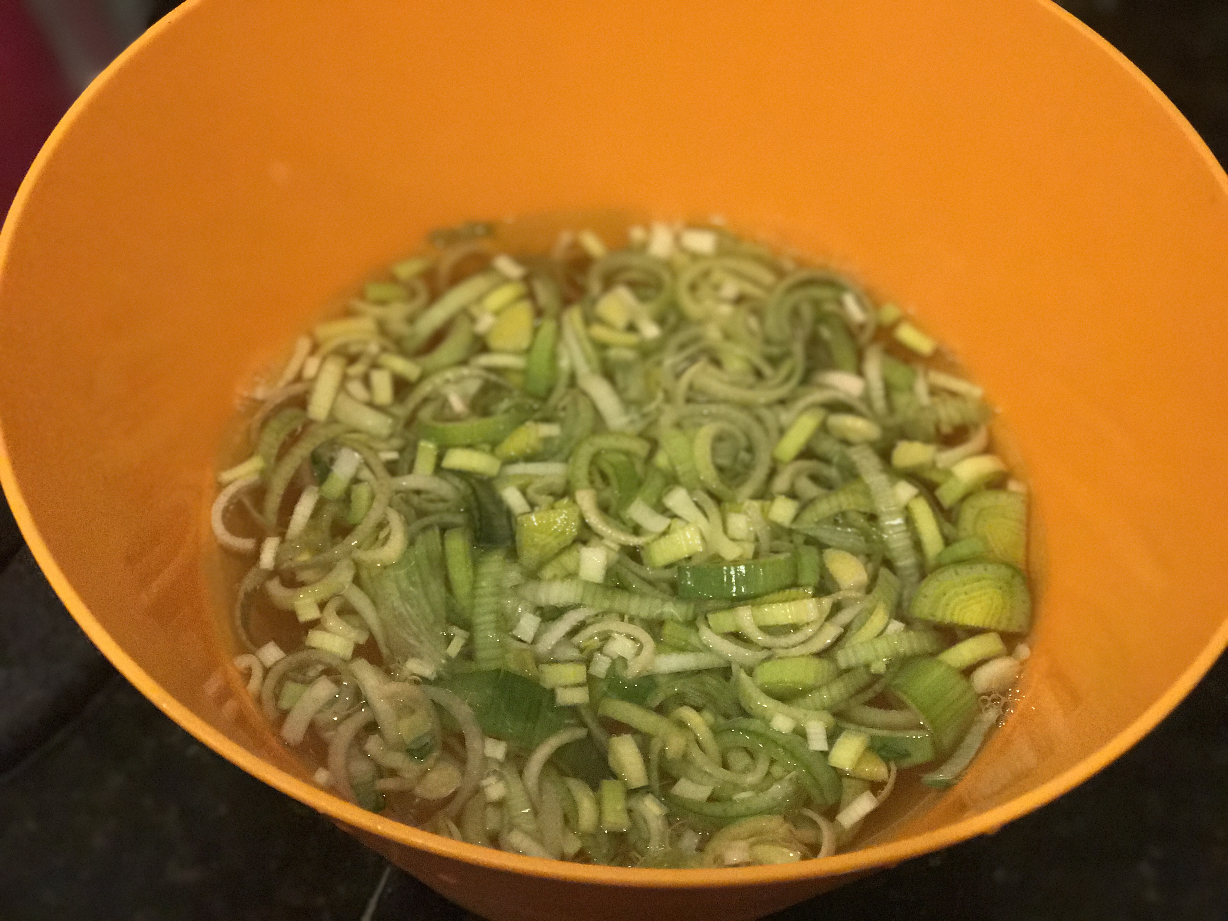 Once they were all sliced, I tossed the leeks into a bowl of cold water, to rinse of the dirt. Leeks are super dirty. Literally covered in dirt.