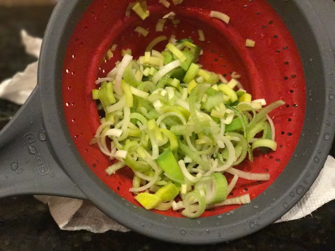 I swished them around a little bit and then let them soak. From here, I scooped the leeks out with a slotted spoon and placed directly into a colander, for a final rinsing.