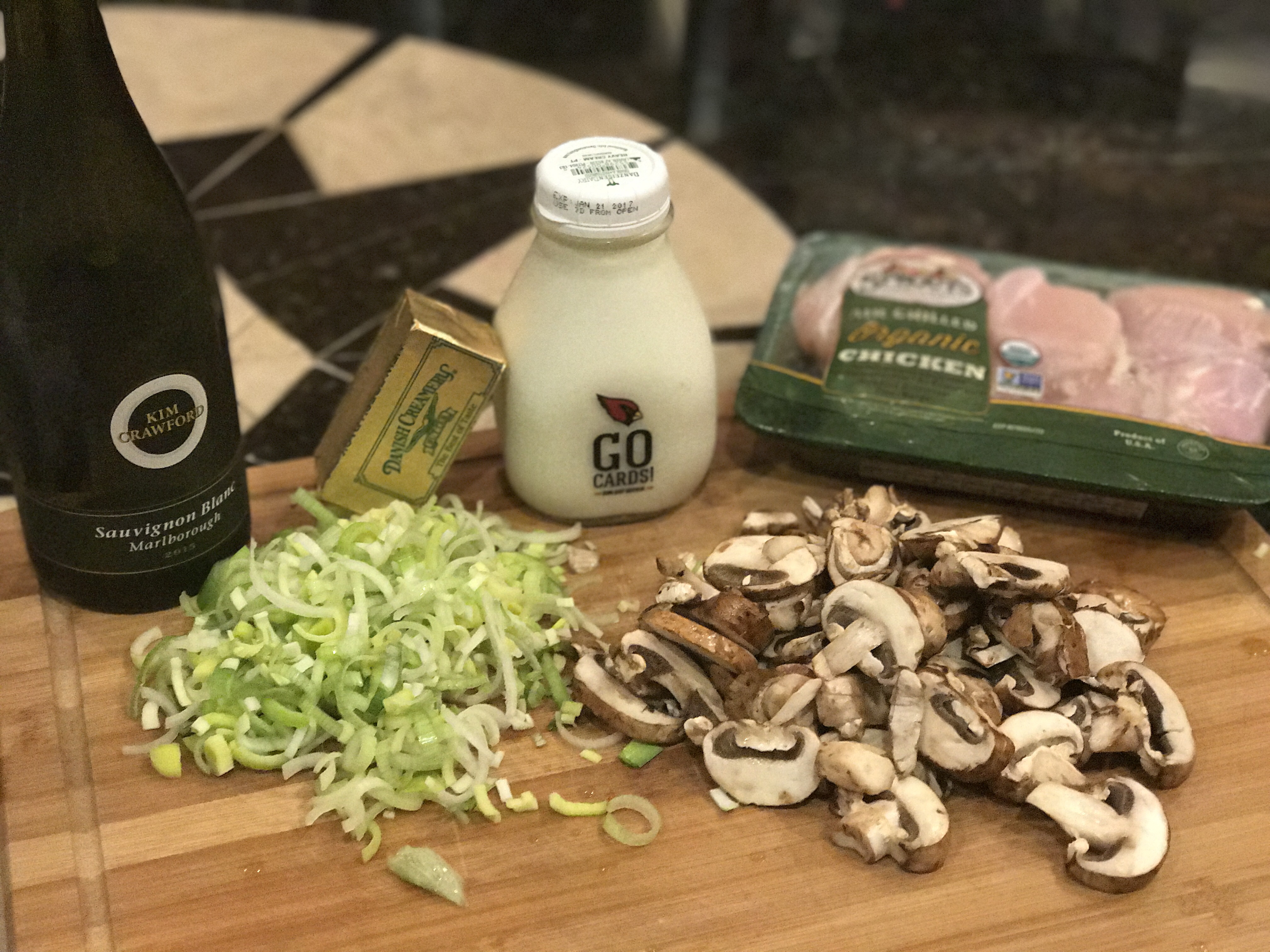 Step 5: Now, your leeks and mushrooms should both be a little softer and brighter in color. This means it’s wine time! Slowly add in the wine and reduce the heat to low.