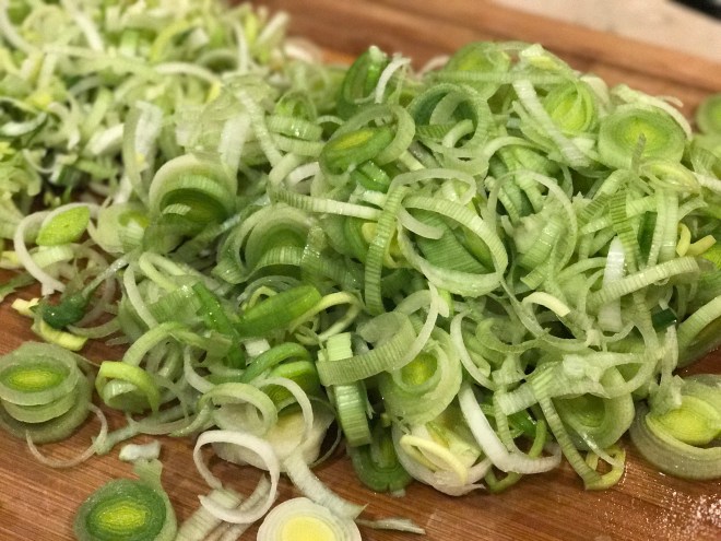 Once your have the white and pale green part of the leek separated from the dark green leaves and the root ball, it’s time to slice! The most important part about this step is making sure the slices are super thin! I used a large knife but looking back on it, it would have been easier to use my mandoline.