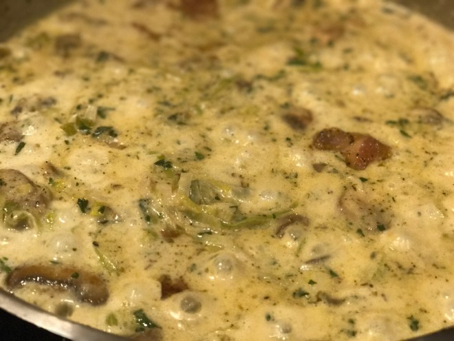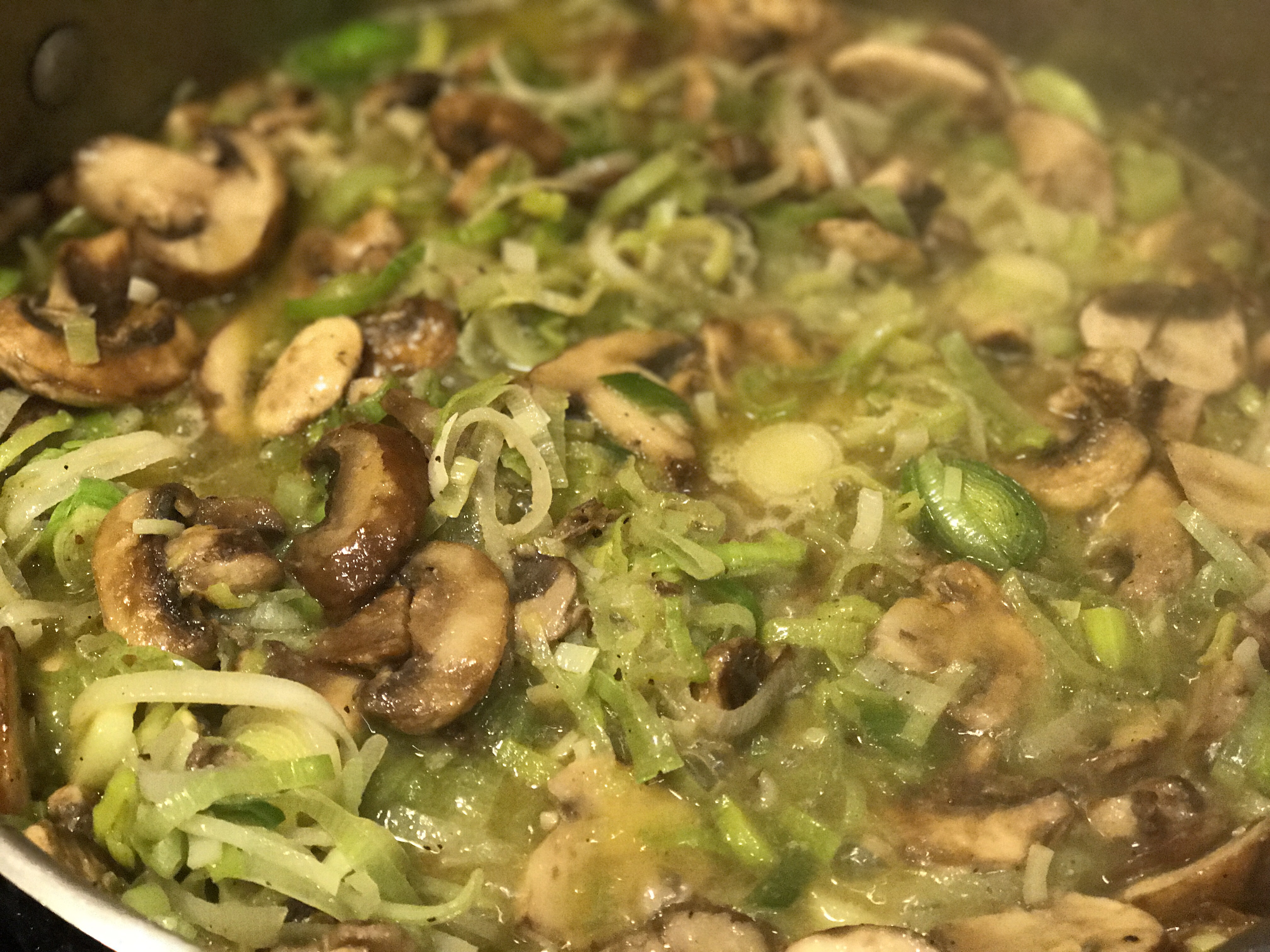Step 3: In a large pan, heat the 6 tablespoons of butter on medium heat. Once the butter is melted, add the mushrooms and leeks. Season with salt and pepper. (I also threw in some garlic powder).