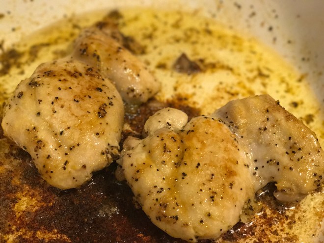Step 4: It’s time to cook the chicken! I always cook the chicken on a medium-high setting. Start by coating the pan with olive oil and letting it heat up for about a minute before adding the chicken. Once the chicken is in the pan, season with the salt and pepper, and just let it cook. You will know when it is time to flip it over because the bottom will begin to turn a golden brown color and it won’t stick to the pan.