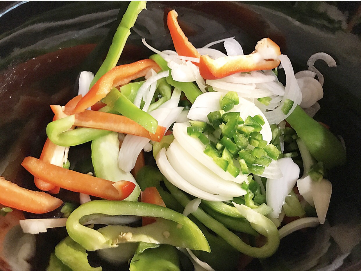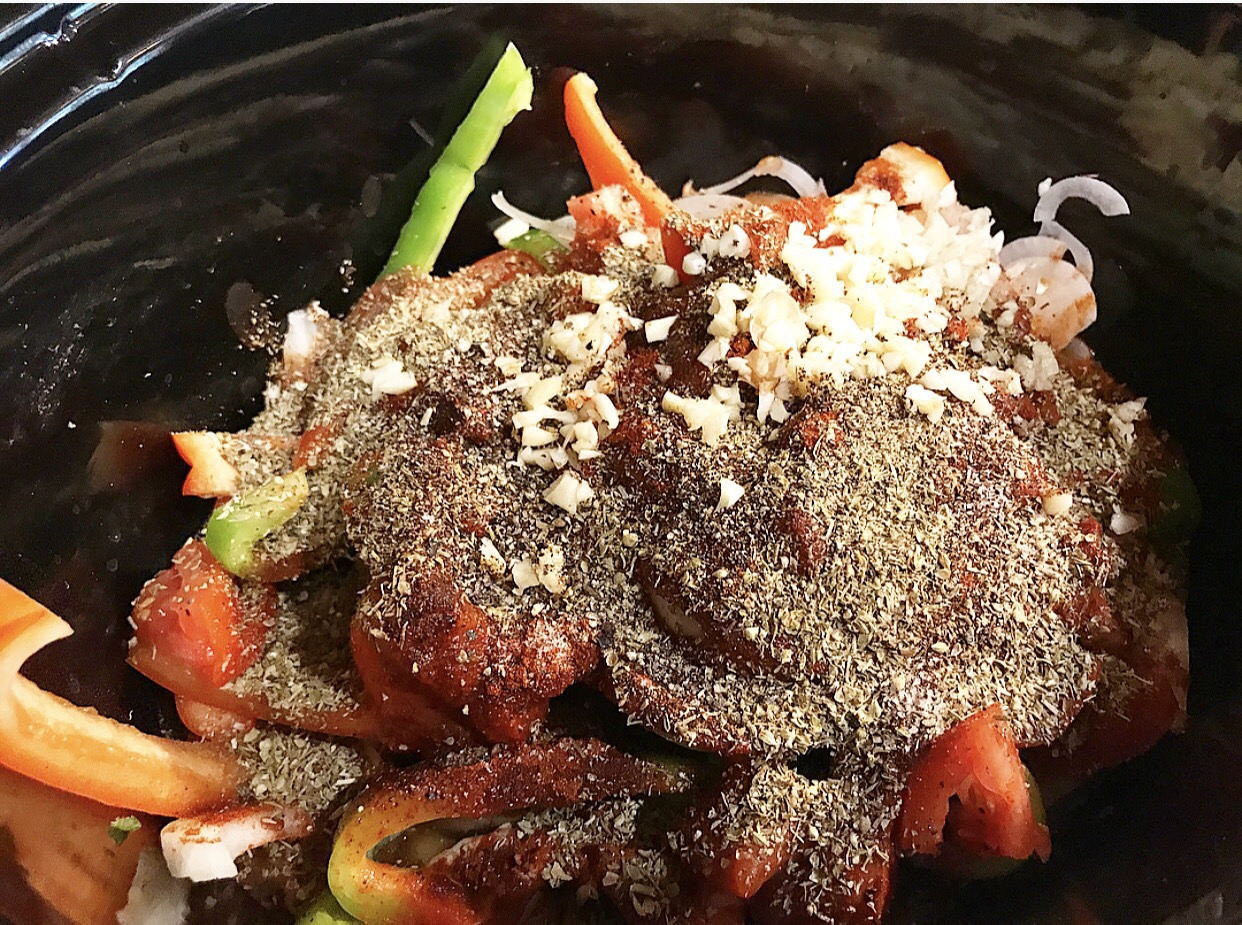 Step 1: Place the bell peppers, onion, and jalapeño in the bottom of the slow cooker.