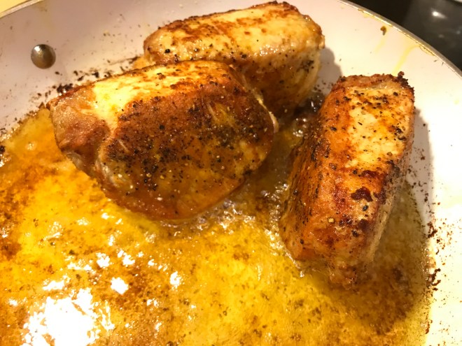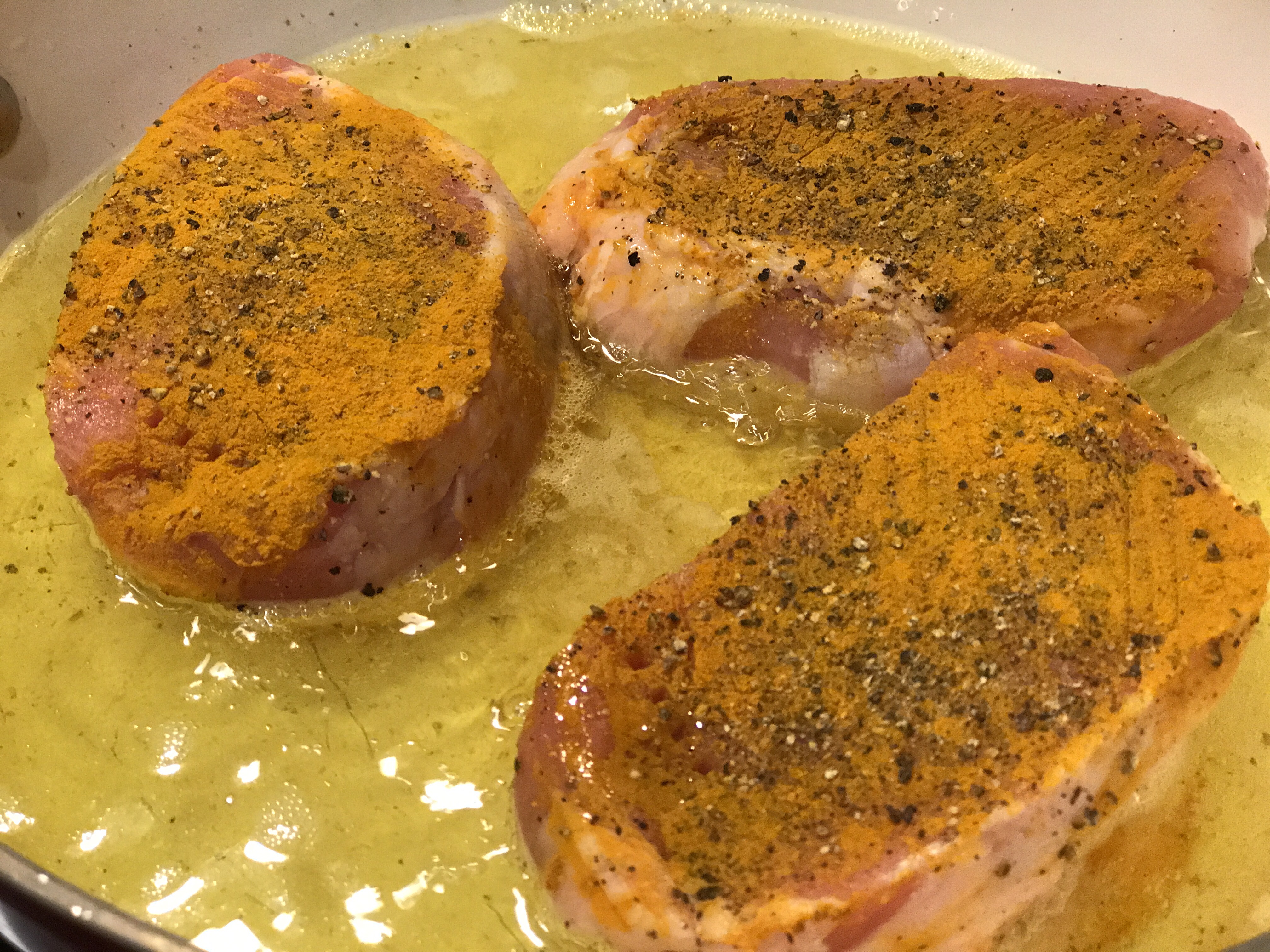 Step 1: Pour the Coconut Oil into a large skillet and heat in medium high. While the oil is heating up, season the pork chops.