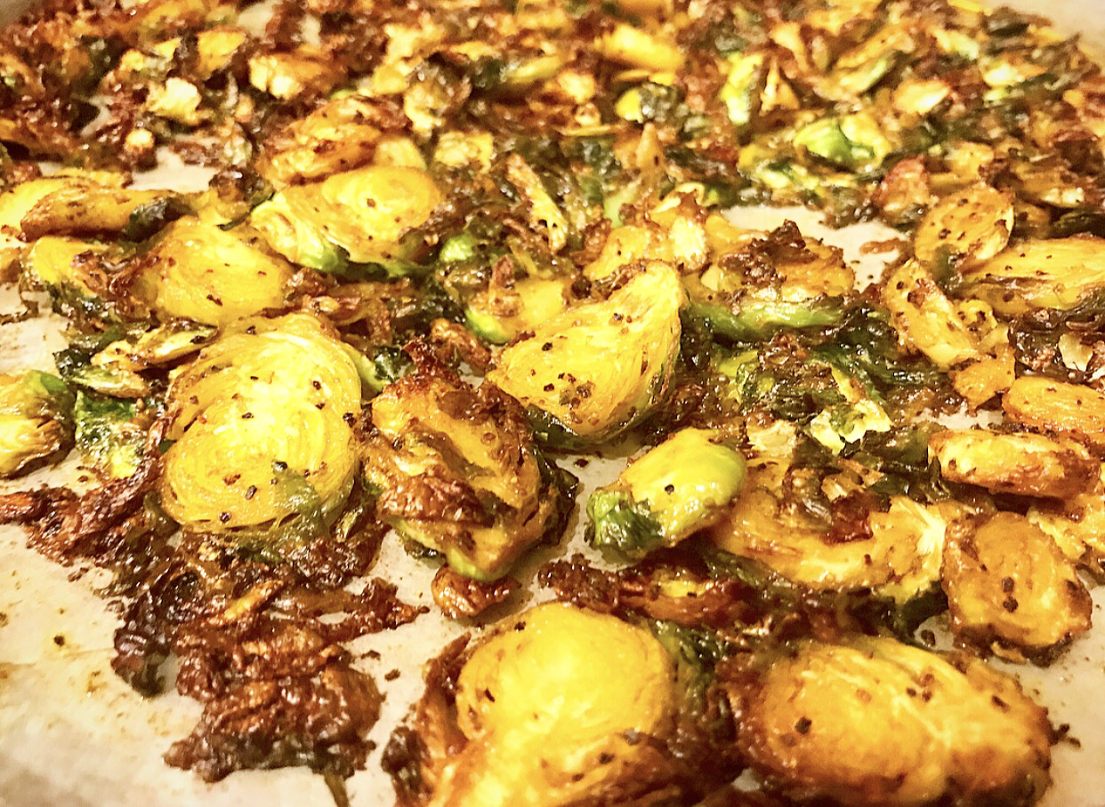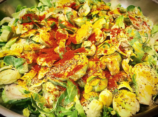 Season with salt, pepper, tumeric, and paprika. While the Brussels are cooking, preheat the oven to 450 degrees Fahrenheit.