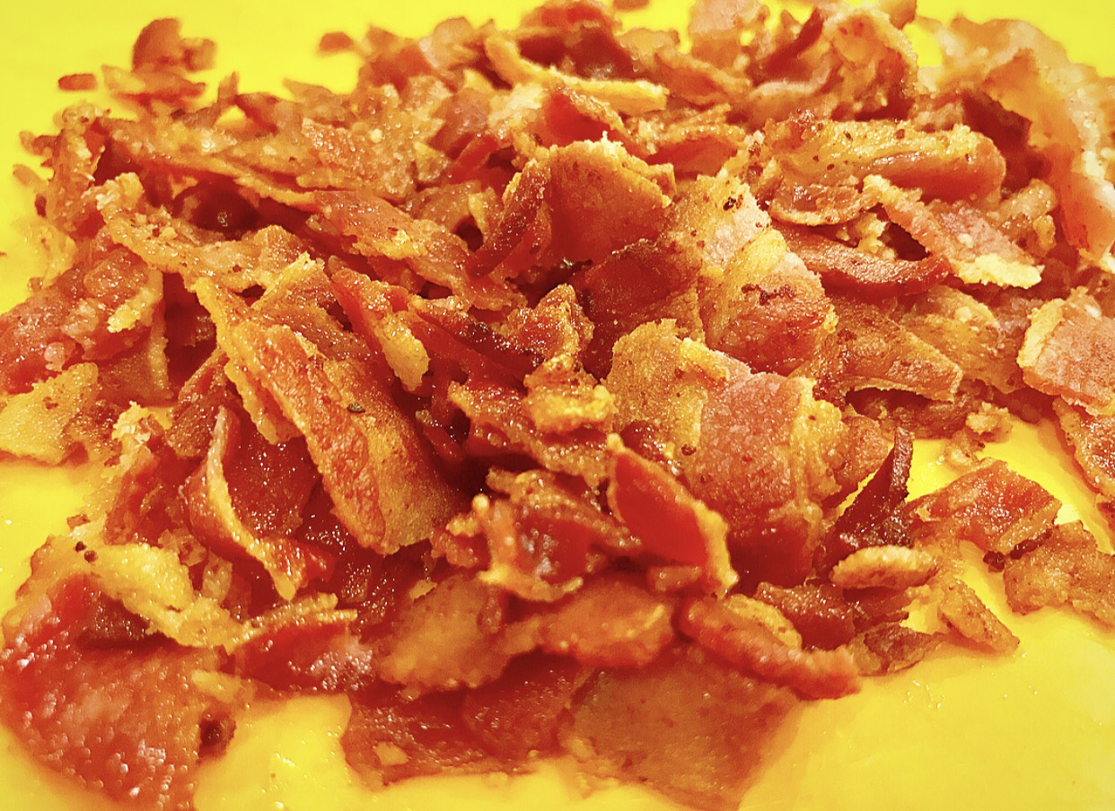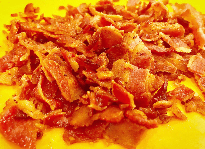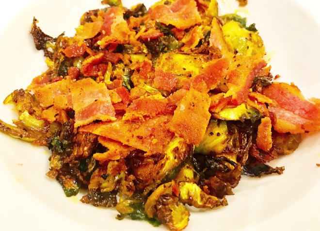 We have 3 people in our house so that’s how it was divided. This will easily make 4 smaller servings or 2 larger servings. Top the Brussel Sprouts with the chopped bacon.