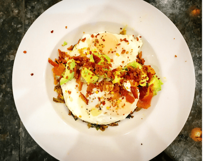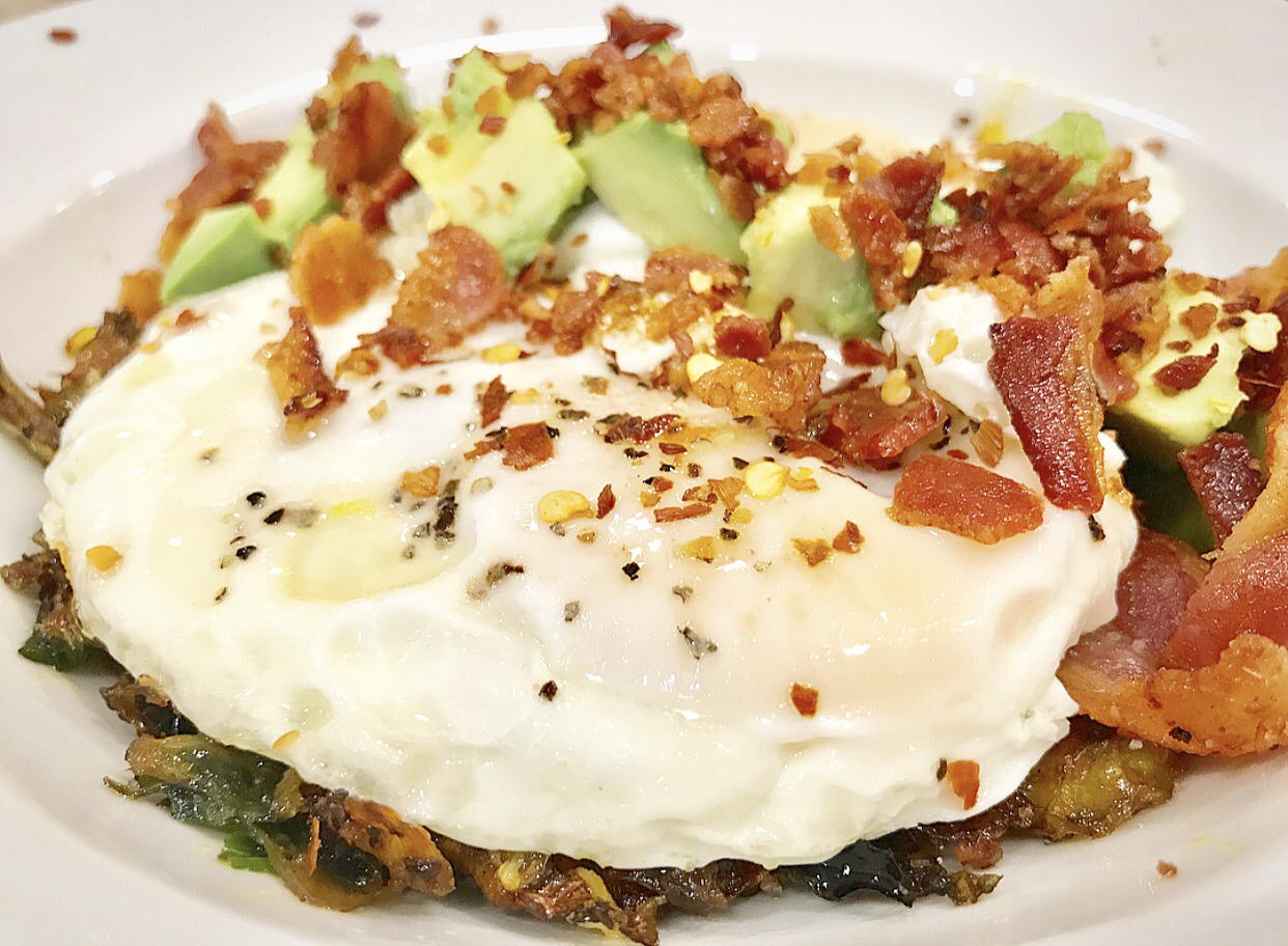 When the eggs are cooked to your liking, place them on top of the Brussel Sprouts and Bacon. Then top with Avocado and Crushed Red Peppers!